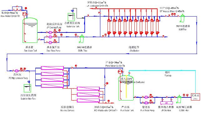 該食品廠成立于1971年,是國家蔬菜水果加工行業(yè)的龍頭企業(yè),產(chǎn)品銷往包括美洲、亞洲和歐洲等4大洲26個不同的國家和地區(qū)。本工程采用超濾+反滲透將泉水凈化為產(chǎn)品加工所需的純水。?