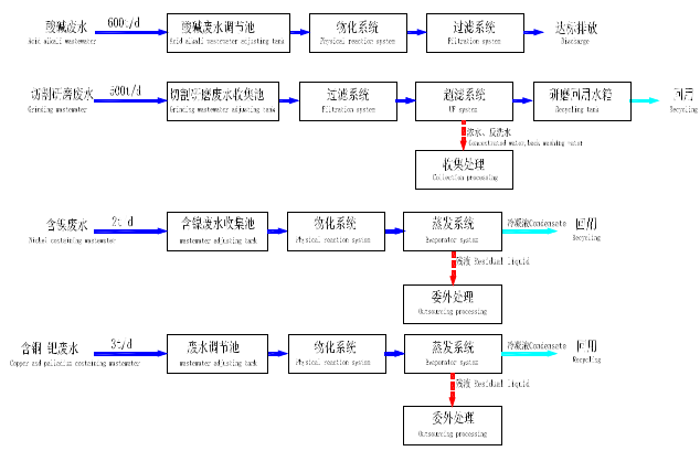 廢水名稱 Wastewater types | 酸堿廢水 acid-alkali wastewater | 切割研磨廢水 Abrasion wastewater | 含鎳廢水 Nickel containing wastewater | 含銅/鈀廢水 copper and palladiumcontaining wastewater |