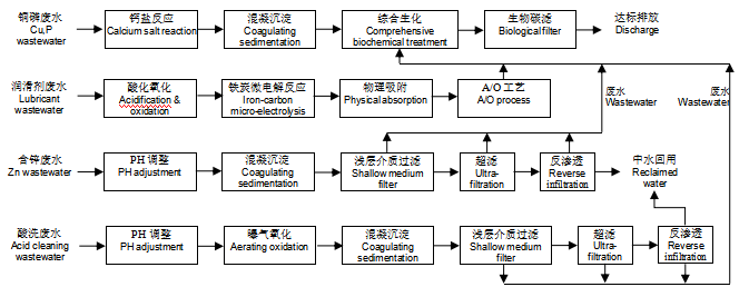 本工程針對該企業(yè)電鍍廢水處理和中水回用處理兩部分展開。根據(jù)“分水分治”的原則對各類生產(chǎn)廢水進(jìn)行針對性的預(yù)處理后,再混合進(jìn)行綜合生化處理,集中排放。采用超濾+反滲透工藝處理酸洗廢水和含鋅廢水預(yù)處理后出水,達(dá)到廠內(nèi)循環(huán)冷卻補(bǔ)充水的要求。