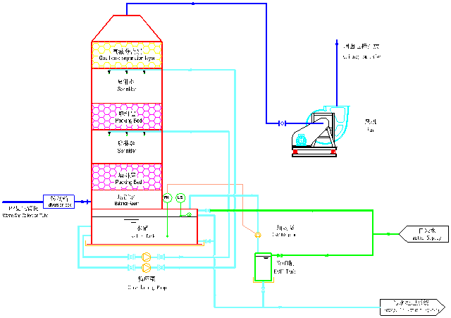 廢氣收集處理系統(tǒng)按照生產區(qū)間劃分,實行獨立控制。廢氣處理塔均采用進口優(yōu)質PP材料制作,集中布置于室外。